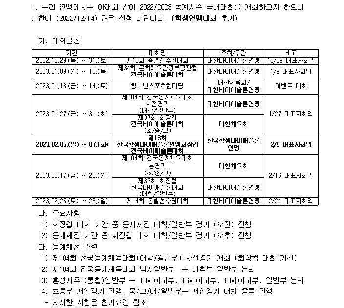2022/2023 µ¿°è½ÃÁð ¹ÙÀֽ̾½·Ð ±¹³»´ëȸ¸¦ ¾Æ·¡¿Í °°ÀÌ °³ÃÖÇϰíÀÚ ÇÏ¿À´Ï,